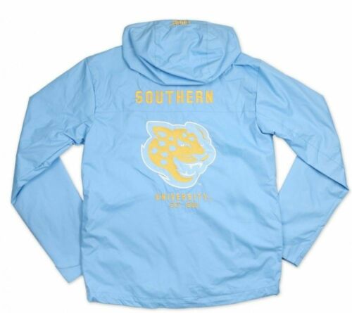 Southern University Windbreaker Jaguars [Color] - Sky Blue; [Features] - 100% polyester, Team logo embroidery sleeve, front & back, 100% Officially Licensed Product; [Care] - Hand wash cold with like colors, Hang dry, Flat dry